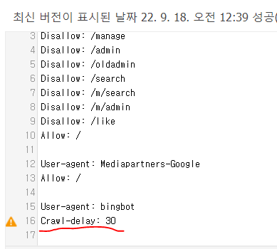 8) 나의 Robots 내용이 아래와 같으면 하단의 문장 때문에 크롤링에 오류가 생기는 것이다.