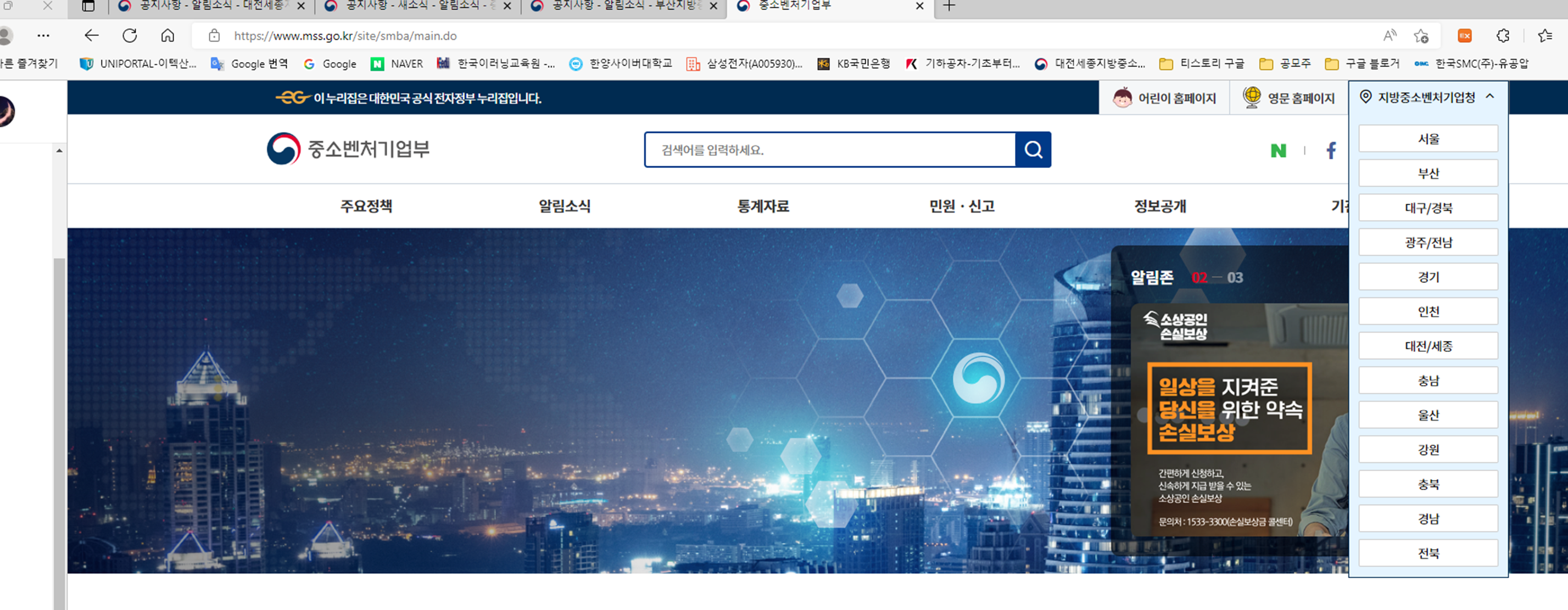 2. 중소벤처기업부에서 오른쪽 상단에 해당 지역 중소벤처기업청을 클릭.(해당 지역 클릭)