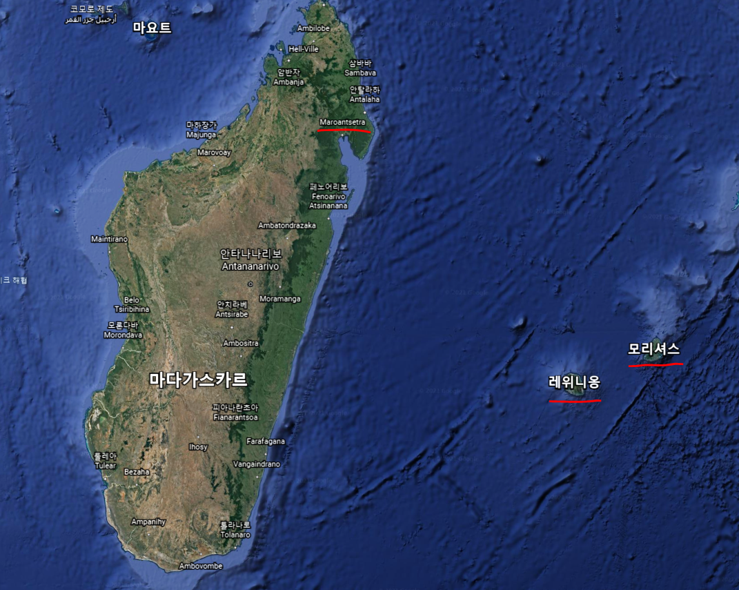 오늘 여행지는 마다가스카르 오른쪽 작은 섬 레위니옹과 모리셔스 입니다. 시간나면 Maroantsetra도 가보겠습니다.