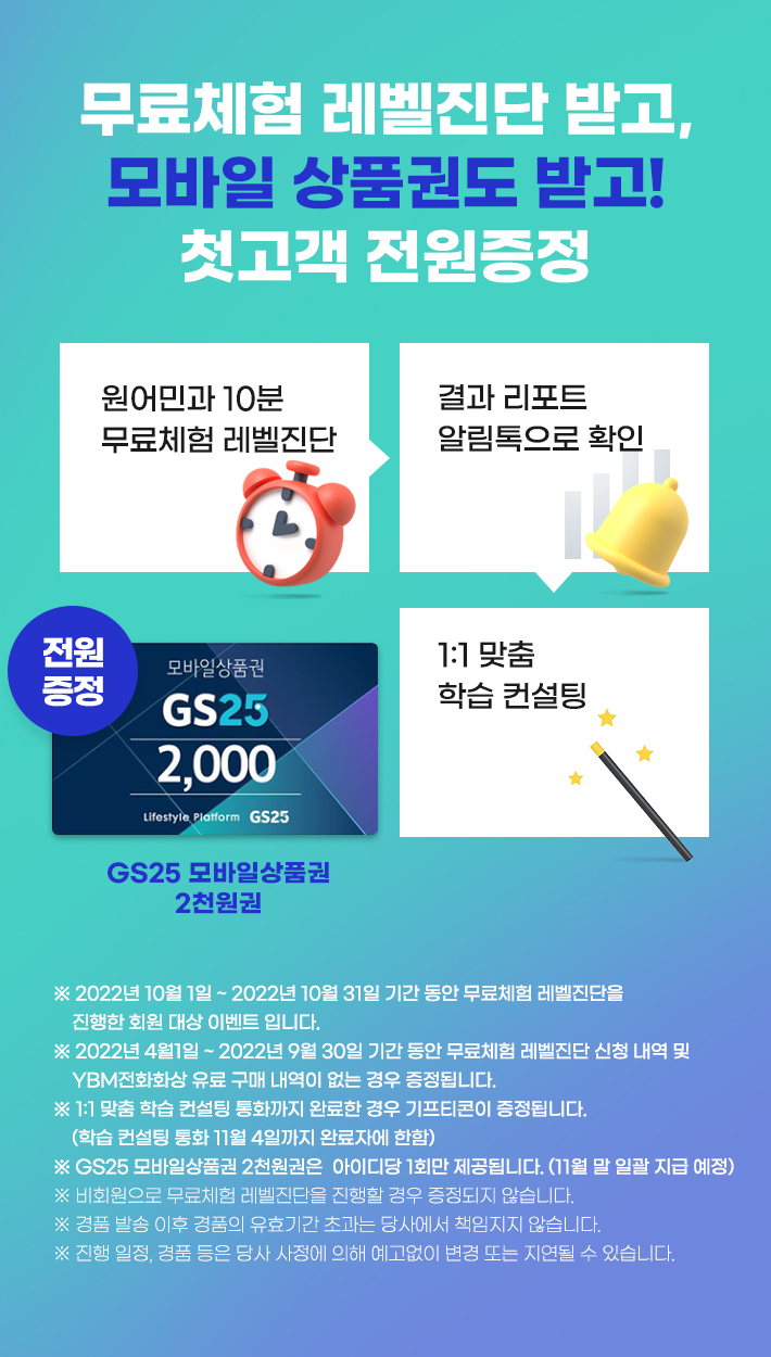내 스피킹 레벨이 궁금하다면? 왕초보도 쉽게 할 수 있는 초간단 스피킹 진단! 10월 첫 수강 압도적 할인 혜택! 첫 구매 고객은 월 최저 18,900원부터! 지금 바로 신청하고 전원 증정 GS25 상품권도