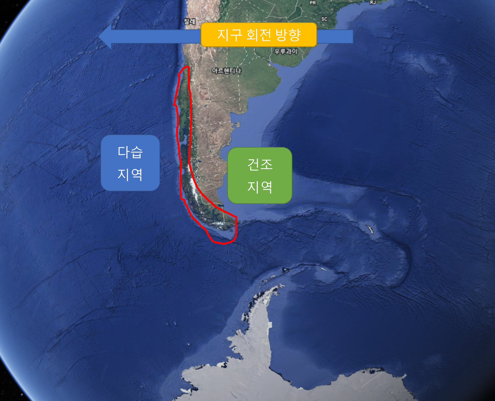 지도에서 보시는 바와 같이 지구의 자전으로 비가 많은 지역은 고온 다습, 산맥을 지나는 반대쪽 지역은 건조한 지역으로 나눠 집니다.