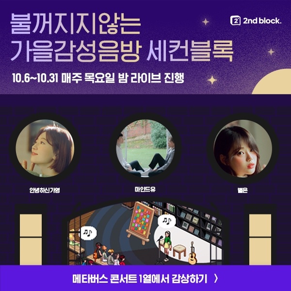 내 방에서 펼쳐지는 가을 미니 콘서트 편하게 누워서 1열에서 감상 어떠세요? 매주 목요일밤 9시에 펼쳐지는 “세컨블록 가을감성음방” 무료로 라이브 감상하세요! 모두의 메타버스 세컨블록