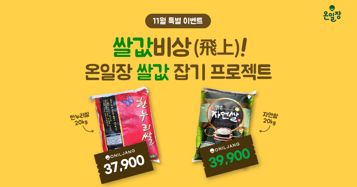 온일장 11월 쌀값 잡기 프로젝트! 식당 사장님들! 치솟는 물가에 고민이셨죠? 잠시나마 온일장에서 그 고민을 덜어드릴게요! 오직 온일장에서 만날 볼 수 있는 가격! 한누리쌀/자연쌀 20KG 3만원대