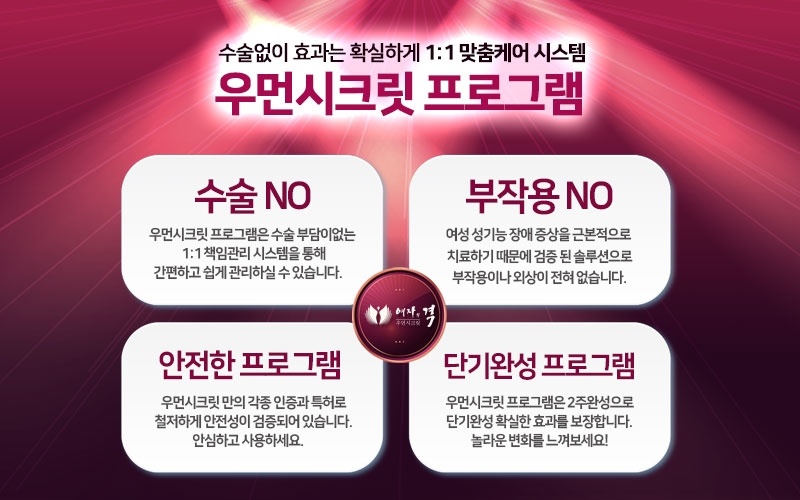 - 우먼시크릿 솔루션은 한국식품의약품안전처로부터 허가받은 제품들로 구성되어 각종 인증과 특허로 안전하며, 수술 없이 부담이 없습니다.