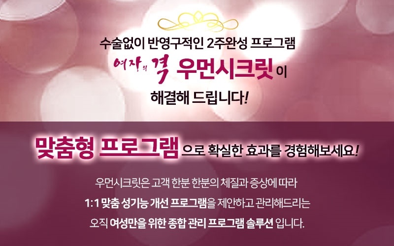 - 이러한 고민을 간편하고 쉽게 반영구적으로 개선할 수 있는 우먼시크릿 솔루션은 편안하고 안전하게 고객 한분 한분께 맞춤 프로그램으로 제안드립니다.
