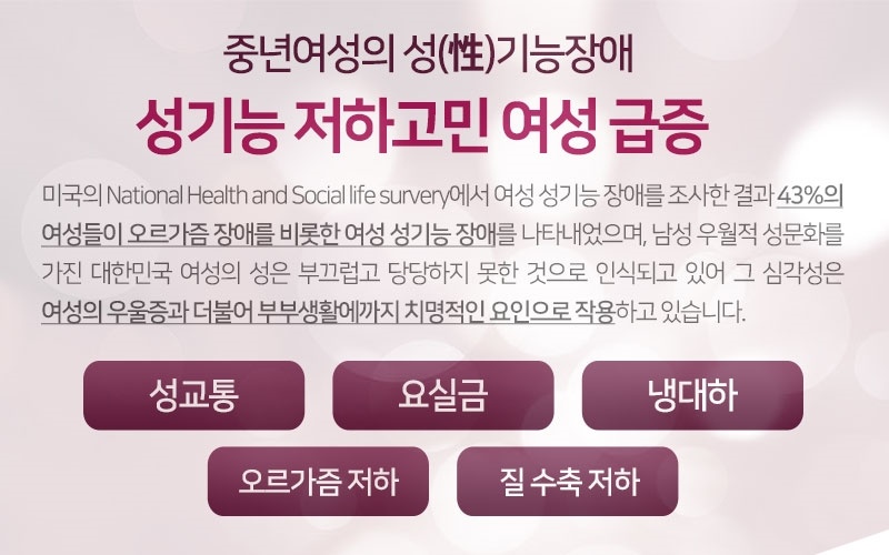 - 국내 중년 여성의 43%가 질 수축 저하 · 오르가즘 저하 · 성교통 · 요실금 등을 비롯한 여라가지 성 기능 장애를 나타내고 있습니다.
