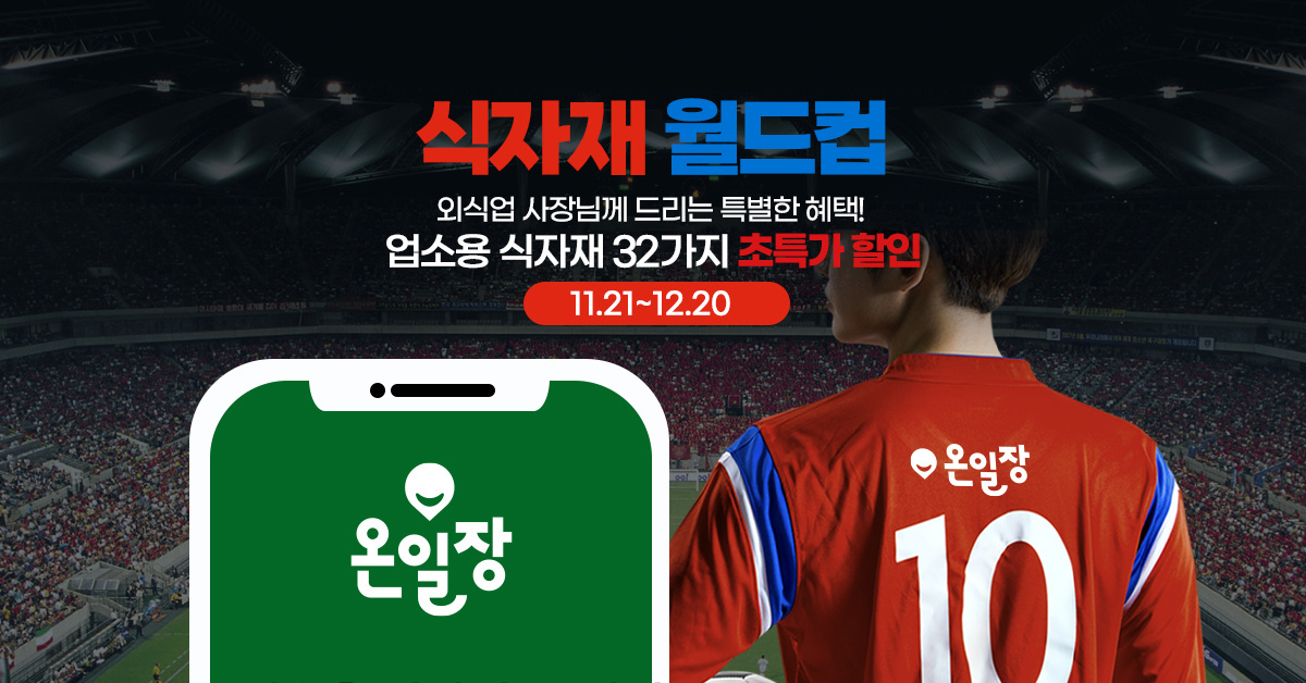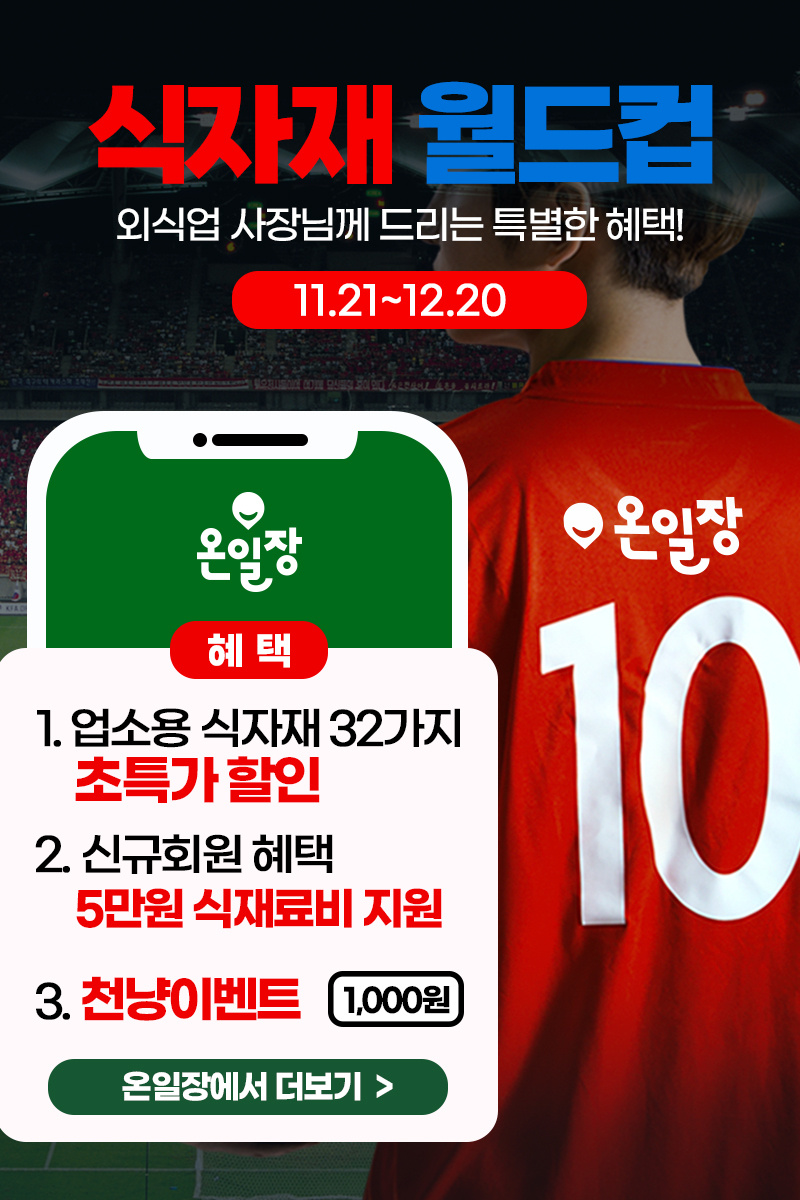 온일장 식자재 월드컵 개막! 11/21~12/20까지 외식업 사장님께 특별한 혜택 드려요! 업소용 식자재를 무려 최대 83% 할인된 특가에 구매할 수 있는 기회! 온일장에서 화려한 필수 식자재 특가 라인업