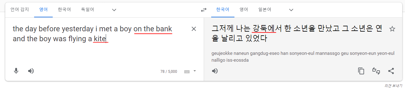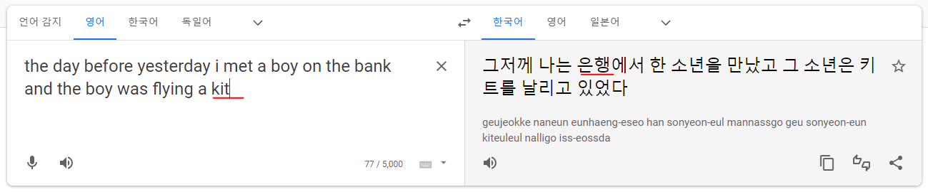 나는 분명이 은행으로 해석했는데 "e"를 작성하자 마자 강둑이 되어 버리는....