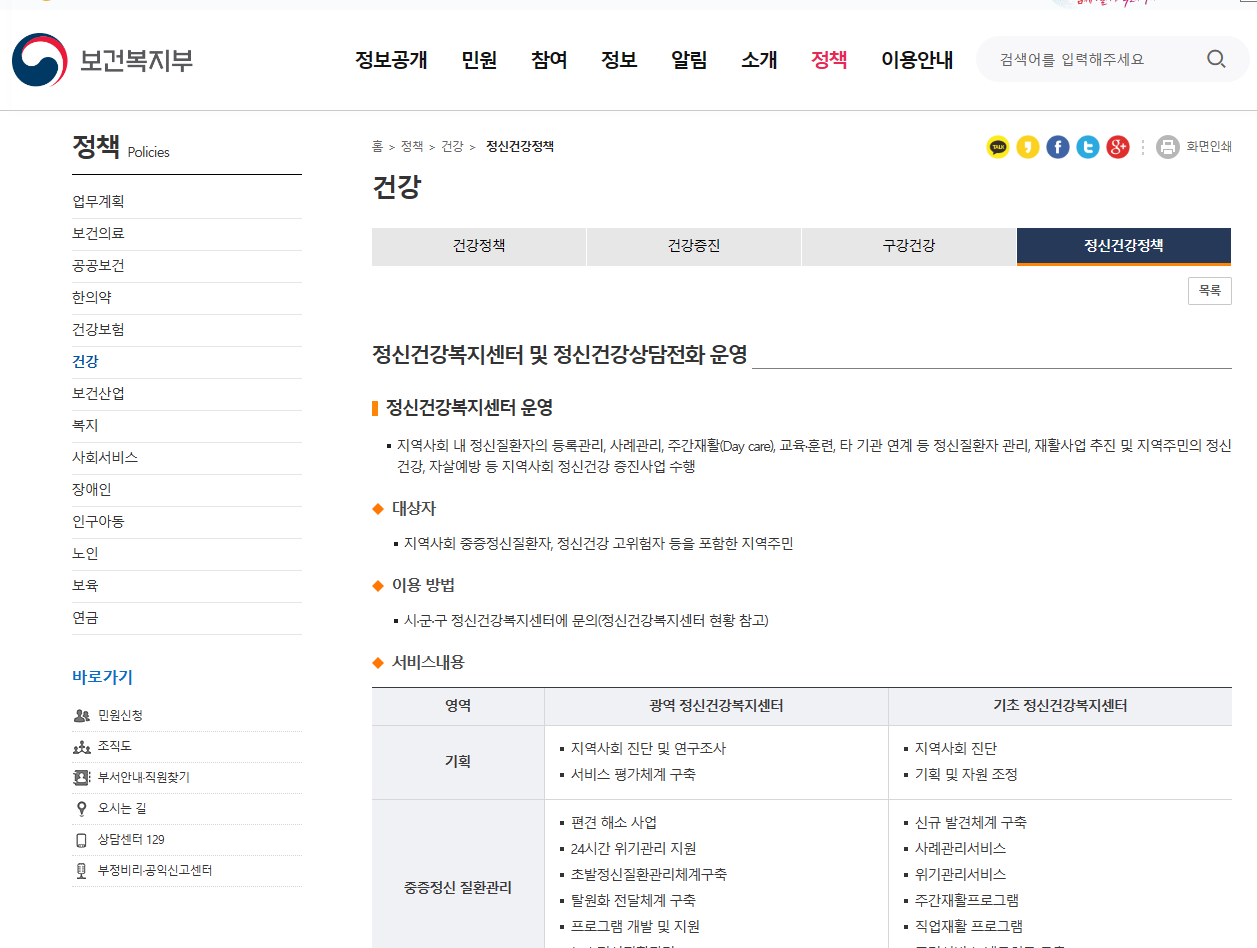 정책 > 건강 > 정신건강정책 > 정신건강복지센터 및 정신건강상담전화 운영 내용보기 | 힘이 되는 평생 친구, 보건복지부 (mohw.go.kr)