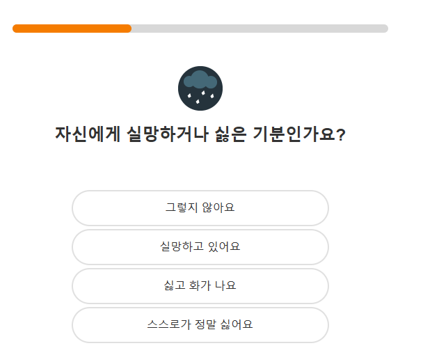 "우울증 자가 진단 검사는 주 1회를 평가를 권장으로 결과에서 " 심한 우울 상태"데 대한 염려가 2주 이상 나올 경우 전문가와의 상의를 권장 한다 "가 아니라 무조건 링크로 넘어가게 했으면 한다. 우울증 있는 사람은 쉽게 해결의 의지가 나타나지 않는게 문제다.