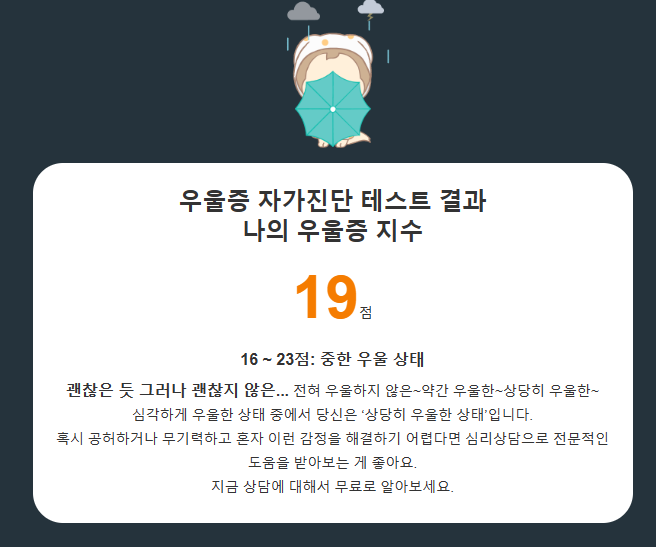 나의 우울증 결과는~!!!!! 중한 우울 상태 ㅋㅋㅋ 괜찬은 듯 그러나 괜찮지 않은...^^;