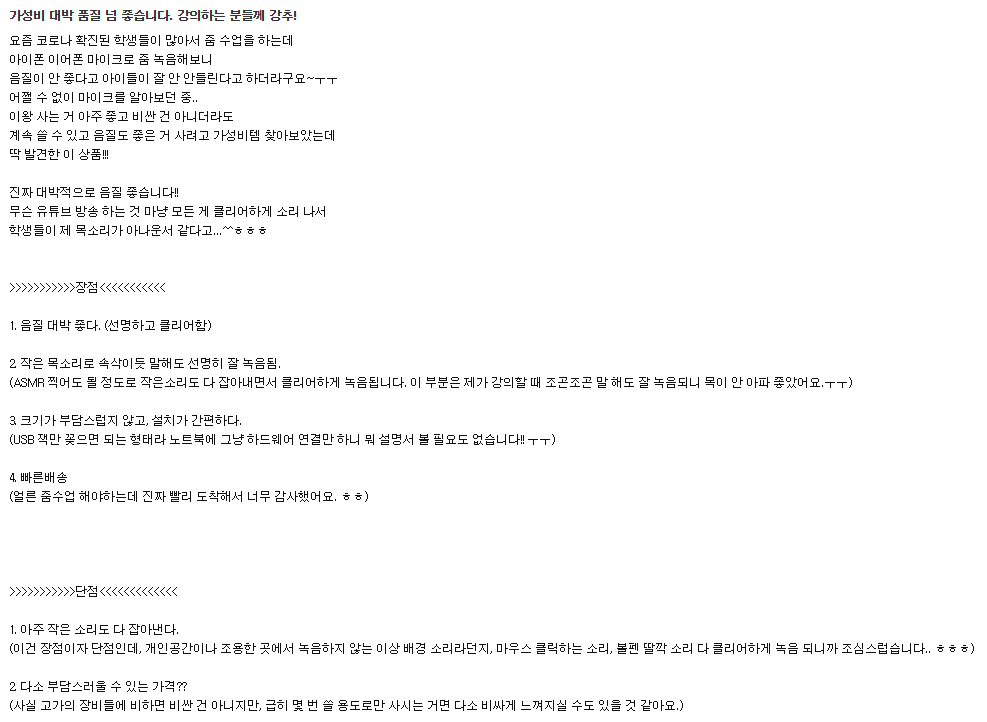 6. 후기/상품평 검증 : ★★★★★ 별 5개 후기 확인→ 아주 작은 소리도 다 잡아 낸다는 것은 장점에 속하지 않을까요?