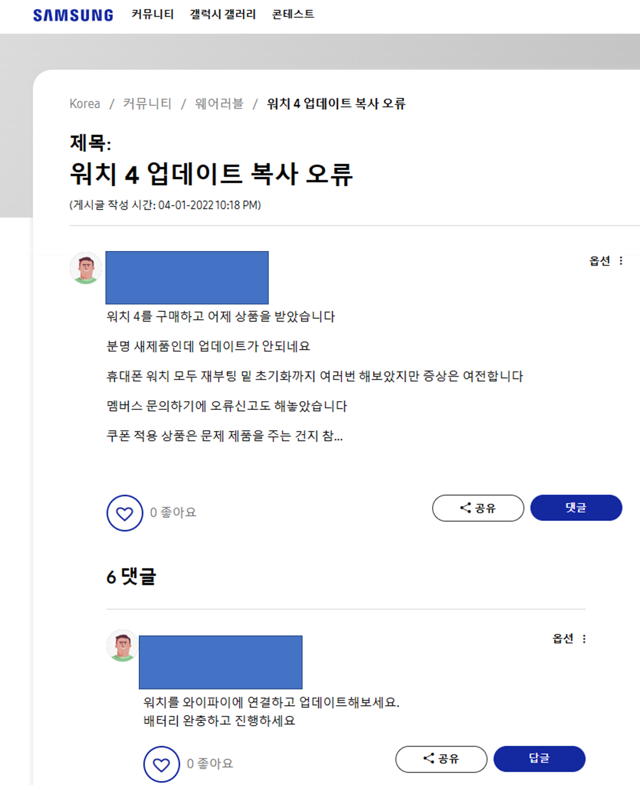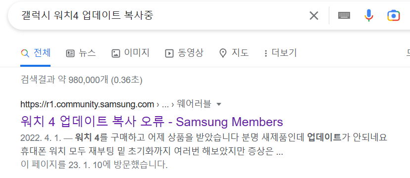 얼마 전에 구매 하였던 갤럭시 스마트 워치 4가 몇 일이 지나도 배터리만 먹기만하고 계속 "업데이트 복사중" 으로 무한 대기중이어서, 해결 하기 위해 검색을 해 보았지만 만족할 만한 답변을 못찾았습니다.
