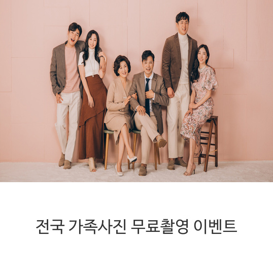 무료 가족 촬영 신청 조건 1. 부부나이합산 90세 이상 가족 2. 부부나이합산 90세가 안되는 경우 자녀 나이가 15세 이상인 가족 3. 3대 가족 무료 가족 패키지 1. 가족사진&리마인드 웨딩 무료촬영 가