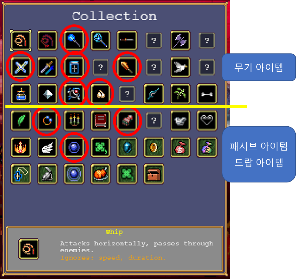 아이템은 총 3가지로 무기아이템, 패시브, 드랍으로 나눌 수 있고