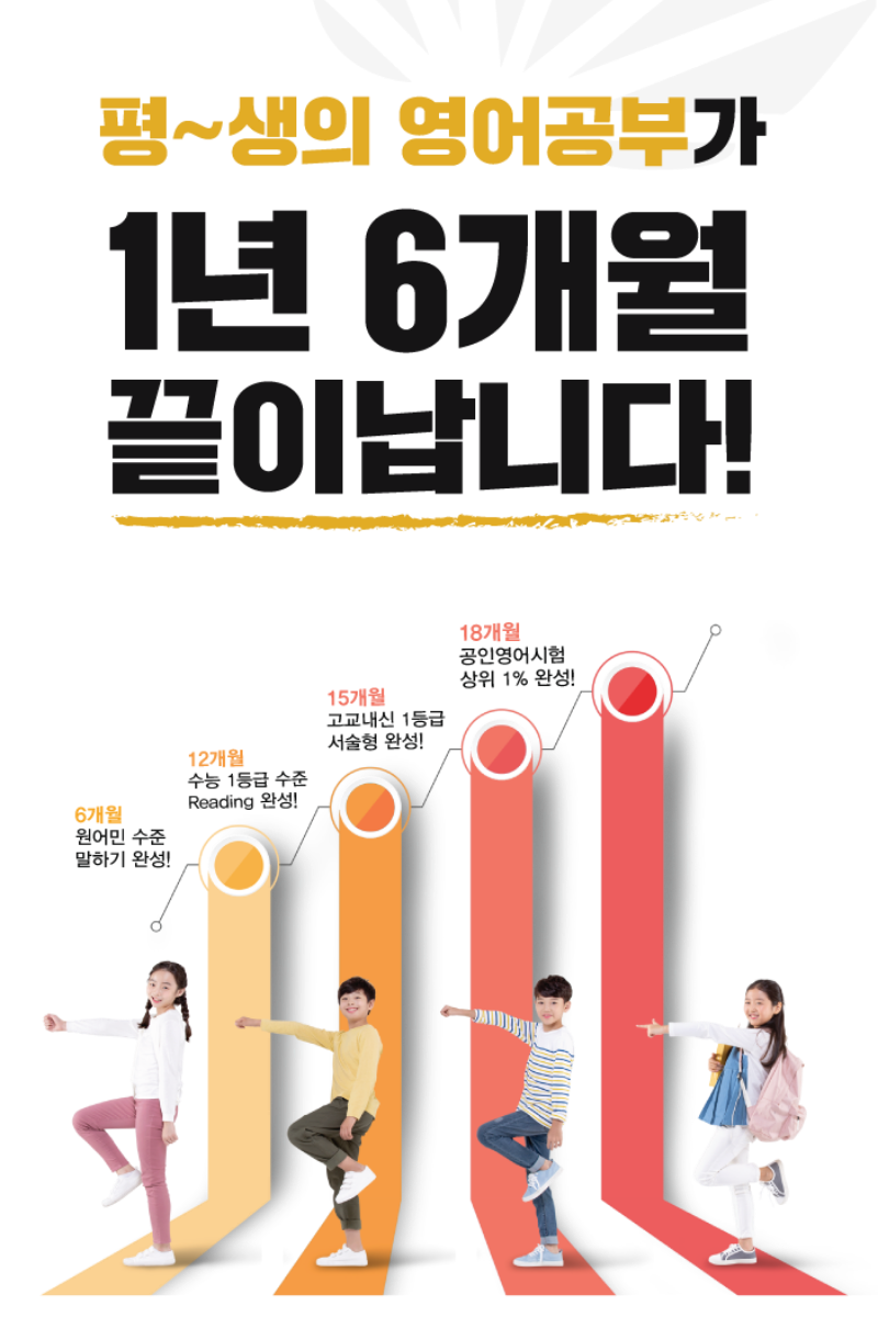 초등학생때 딱 1년 6개월이면 평생의 영어공부 끝 영어로! speaking 6개월 과정 성과 보장! 성과 미달 시 수강료 100% 환불! 지금 등록하면 수강료 50%할인 영어로는 초등4학년 ~ 중등3학년까지 모집