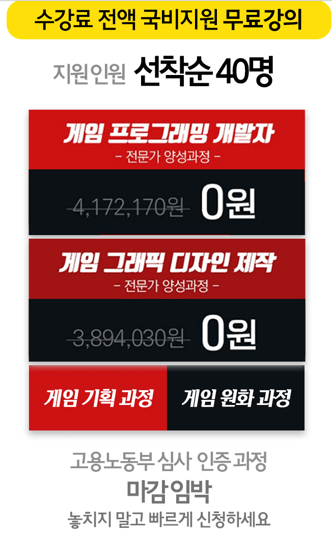 게임프로그래밍, 게임기획, 게임원화, 게임그래픽 과정 / 국비지원연계과정으로 취업까지 한번에!