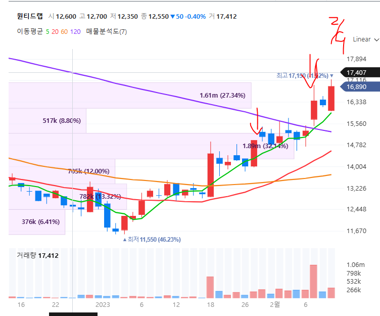 과거 캔들 이때만 해도 120일선에 꺽일줄 알았는데.... 현재 캔들..... 이럴줄 몰랄네.....120일선을 받쳐서 올라갈 것 같음.... 이렌텍 23.01.27, 원티드랩 23.01.27 진행 방향 (tistory.com) 이렌텍 23.01.27, 원