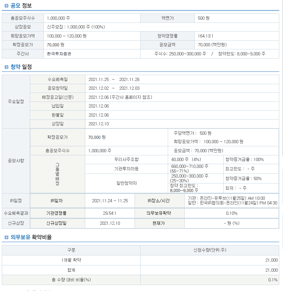 확정 공모가 : 70,000원(아......350,000원만 있다면 1주 사겠네요....근데 의외네요...희망 공모가 보다 낮은 확정 공모가라니...무슨 경우인지.....)