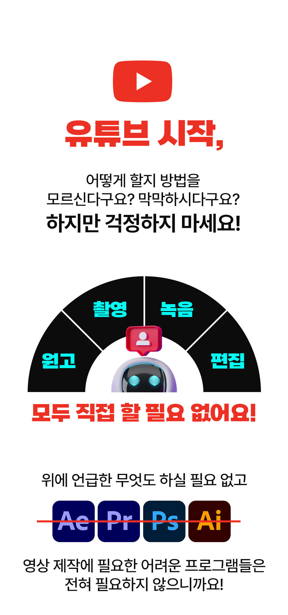목차 1. 숟가락 들 힘만 있다면 유튜브를 해야 하는 이유 2. 영상 주제 정하는 법 - AI 편집으로 구독자 2000명 채널도 조회 수 6만 나오는 채널 주제 - AI 편집으로 두 달만에 구독자 2만 명 모은 채널