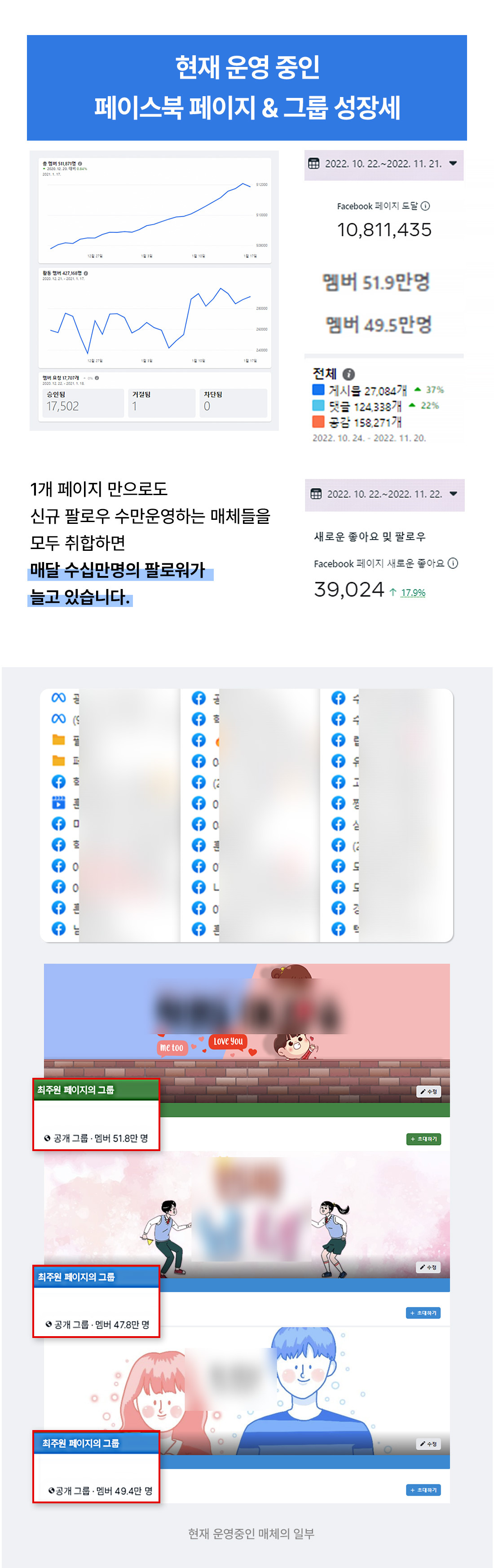 • SNS (페이스북, 인스타그램) 약 1000만명 팔로워 매체 보유 (페이스북 그룹 ‘국내 1위’ 학생들 대나무숲, 훈녀훈남, 인싸남녀 등등)