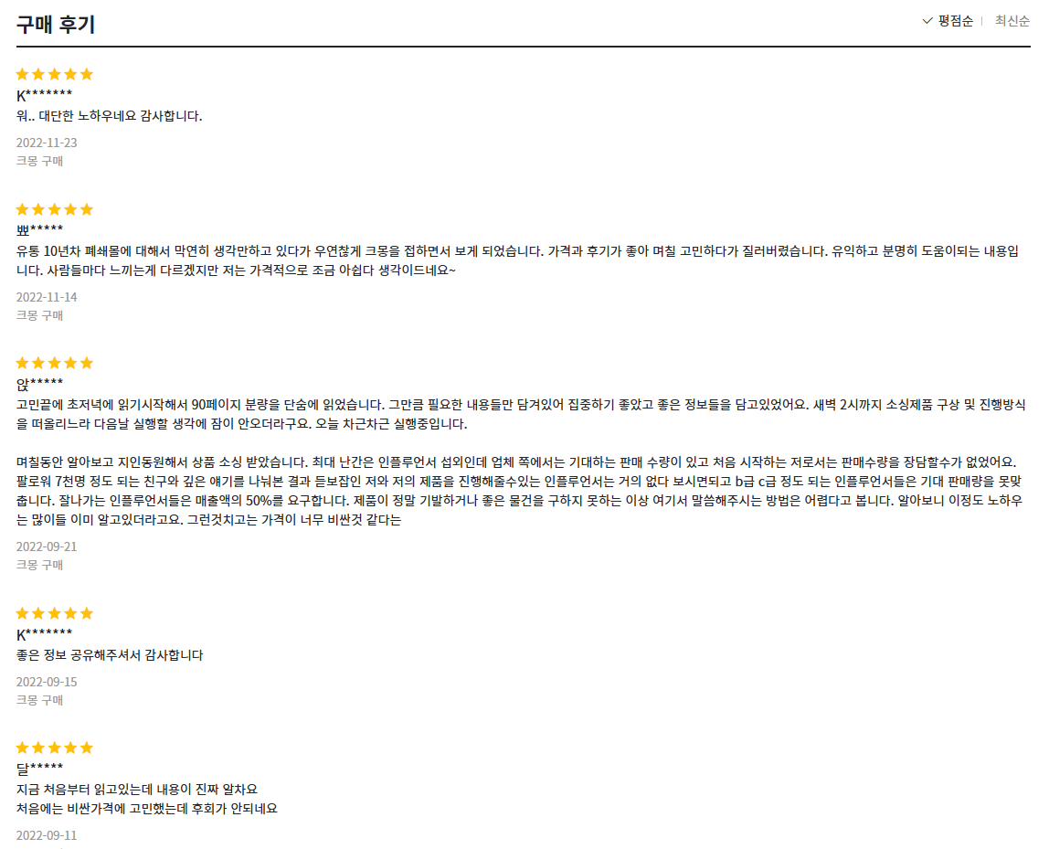 목차 1. 소개 2. 폐쇄몰, 공동구매란 무엇인가? 3. 인플루언서가 아니어도 상관없다. 벤더로 수익내기! 4. 저자가 판매했던, 무조건 잘 팔릴 수 밖에 없는 30~45% 마진율의 상품 5. 잘팔리는 폐쇄몰용