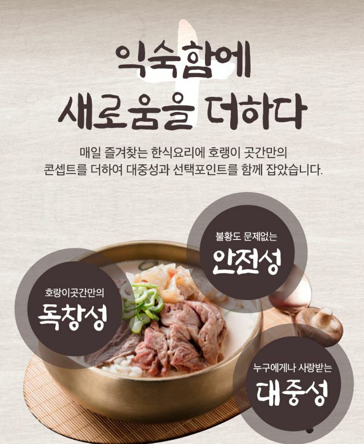 365일 만석! 한식맛집 호랭이 곳간 **신규오픈매장** 인천 스퀘어원점 / 5월 오픈 대구 달서구점 / 6월 오픈예정 인천 주안점 / 7월 오픈예정 프랜차이즈가 아닌 맛집을 창업하세요! 줄서서먹는 호
