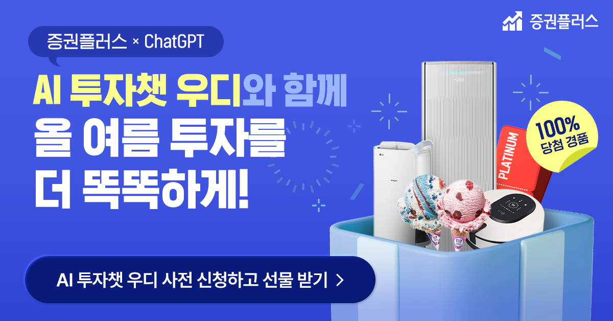 증권플러스에서 무료로 제공되는 AI 투자챗 우디, 사전신청만 하면? 추첨을 통해 에어컨 등 AI 여름가전을! 참여만 해도 인공지능 분석 서비스 3종을 무제한으로 쓸 수 있는 Platinum 클럽 100% 지급