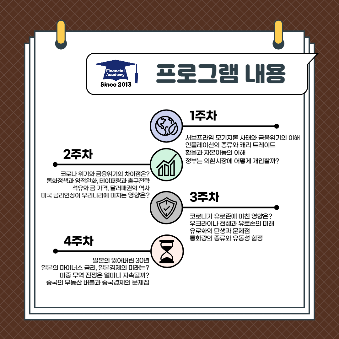 세계 경제의 흐름을 파악함과 동시에 환율, 인플레이션 등 금융의 기초와 튼튼한 기본기를 닦을 수 있는 기회!