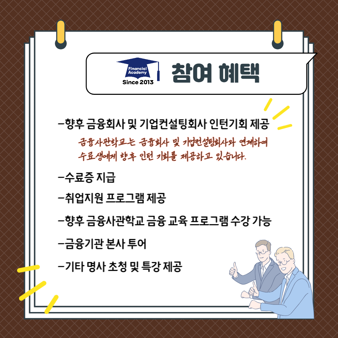 수료생에게는 수료증 및 금융회사 인턴 기회가 주어지며