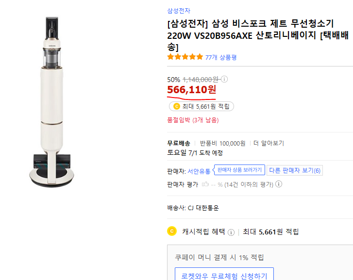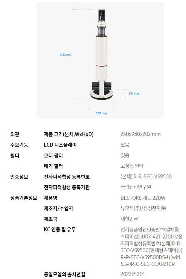 [삼성전자] 삼성 비스포크 제트 무선청소기 220W VS20B956AXE 산토리니베이지 [택배배송]
